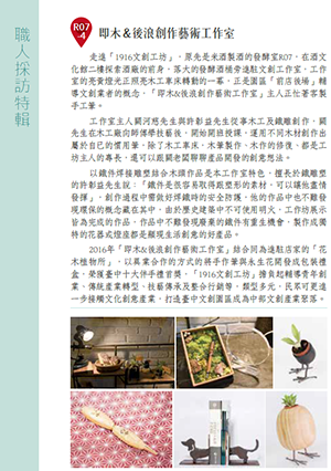 關於即木 “即”字意為貼近、當下,2016即木工藝以貼近生活、專注客製的理念成立,所有作品皆親力親為、手工打造,注重素材的原始呈現與實用性,以製造富有溫度、藝術價值的產品為職志。 主要營業項目為創作木頭鋼筆、原子筆…等木製文具產品,同時開設木筆DIY體驗課程,傳授手工筆製作技術,致力於推廣木筆工藝之美。 我們也做過許多有趣的事、和各領域達人合作。做過展場硬體規劃、商業空間裝置、戶外裝置藝術,並參與諸多競賽獲獎,協助紅點設計獲獎作品打樣、指導學生獲得設計競賽大獎,至各級學校推廣文創產業、分享創業經驗…。 闕河慈 即木工藝負責人 經歷 2018 - Present 雲林觀光局雲遊計畫咖啡業者門面形象設計施工 2017 臺灣文博會 入選串連好店愛臺中創意獎學金指導學生作品獲得金獎(第一名)、佳作大里軟體科學園區臺灣文創藝術博覽會戶外裝置藝術施工臺中文創園區戶外裝置藝術設計施工 2016 成立即木工藝進駐臺中文創園區1916文創工坊加入臺中市藝術亮點特色店家臺灣設計X全球發光國際設計競賽獲奬成果展 關於我 諮商心理系畢業從事就業服務工作多年,服務失業民眾 最終自己失業,誤打誤撞栽進木工的領域 目前擁有一間小小的工作室和大大的夢想 技術 2014 考取國家裝潢木工乙級技術士考取內政部核可建築物室內裝修專業技術人員 2016 習藝傳統木工車枳(師承 藍紘勝)考取臺中市工藝類街頭藝人 2017 開始學習傳統木雕 2018 臺灣工藝研究發展中心基礎漆藝研習班 結訓 2019 考取國家家具木工丙級技術士 2020 考取國家家具木工乙級技術士 聯繫方式 https://thatwood.com.tw/ thatwood2016@gmail.com 0921754345 媒體報導 HERE雜誌HERE雜誌No.108 2016年 9月28日發行 好景賞析報導 Read More 中視【60分鐘】讓文創遍地開花-節目專訪 Read More 台中好生活雜誌2016.11月號 台中十大伴手禮獲獎廠商專題報導 Read More 台中文創雙月刊2016.1-2月號 即木工作室職人採訪特輯 Read More 新一代時報即木工藝手作創作專題報導 Read More 文化部臺灣評論英文專題報導 Read More 獲獎認證 臺中市十大伴手禮精品類 首獎 新北市木質玩具競賽社會組 佳作 臺中市好禮認證2016~2018皆獲認證 文化部文化資產局績優文創工作者